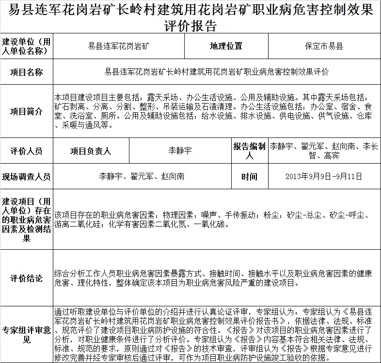 易县连军花岗岩矿长岭村建筑用花岗岩矿职业病危害控制效果评价