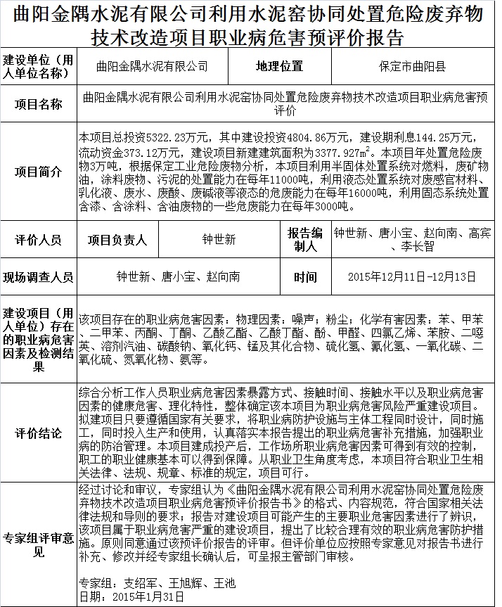 曲阳金隅水泥有限公司利用水泥窑协同处置危险废弃物技术改造项目职业病危害预评价